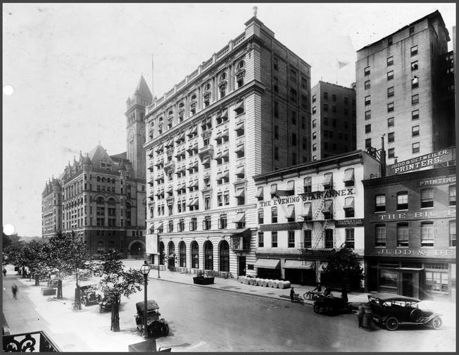 Old photo of street and buildings in Washington. One can see still existing Evening Star and Old Post Office buildings.