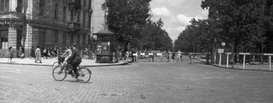 Widok ulicy na miesiąc przed wybuchem Powstania Warszawskiego. Fotografia zrobiona została od strony Placu Unii Lubelskiej.