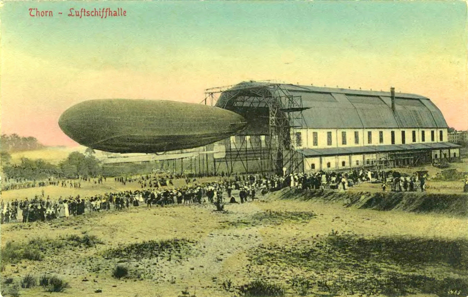 Obiekt wybudowany na początku XX wieku, na zdjęciu wyprowadzenie sterowca Parseval PL 16. Hala została rozebrana po II wojnie światowej. Dziś obiekt już nie istnieje.