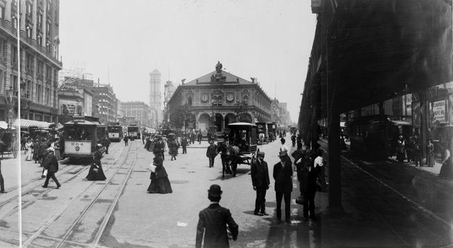 Herald Square with street and elevated railways and Broadway on the left.