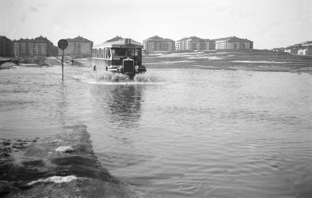 Old bus going through the flooded Stockholm street during Spring. Line number: 81