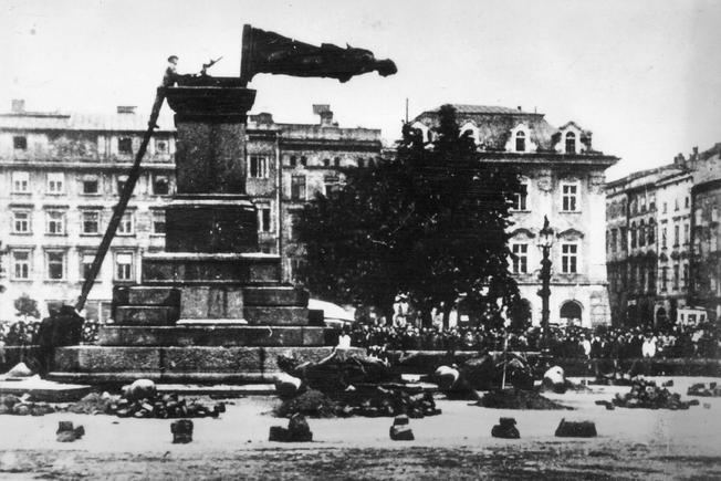 Rynek Główny w Krakowie. Niemcy niszczą pomnik Adama Mickiewicza. 17 sierpnia 1940.