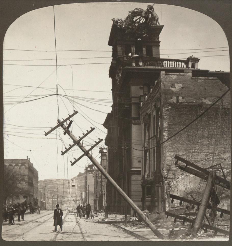 The old Hall of Justice destroyed during 1906 earthquake and Kearny Street. The Hall of Justice was located at Kearny St opposite to the Portsmouth Square.