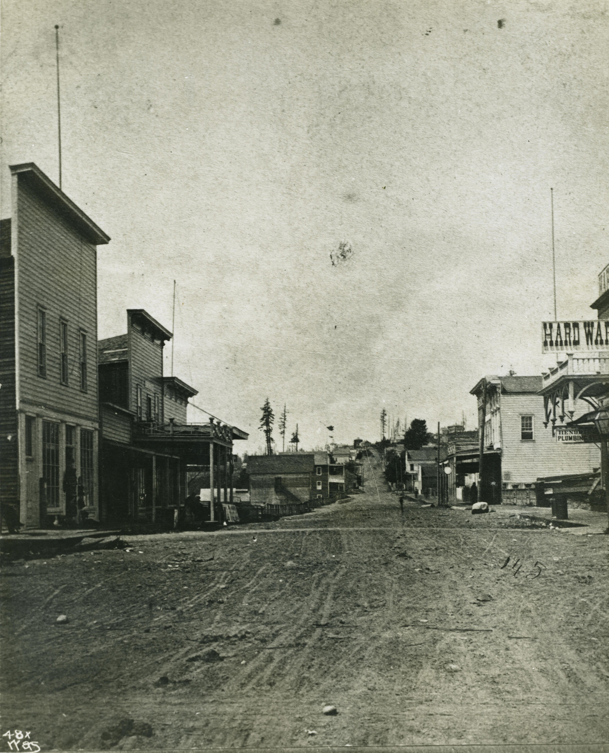 License additional information: http://en.wikipedia.org/wiki/File:Seattle_-_First_Ave_at_Columbia_c._1870.jpg
