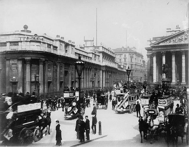 Threadneedle Street and Bank junction. There was and still is the Bank of England and Royal Exchange. Both of these building are visible on the photo with the bank being on the left.