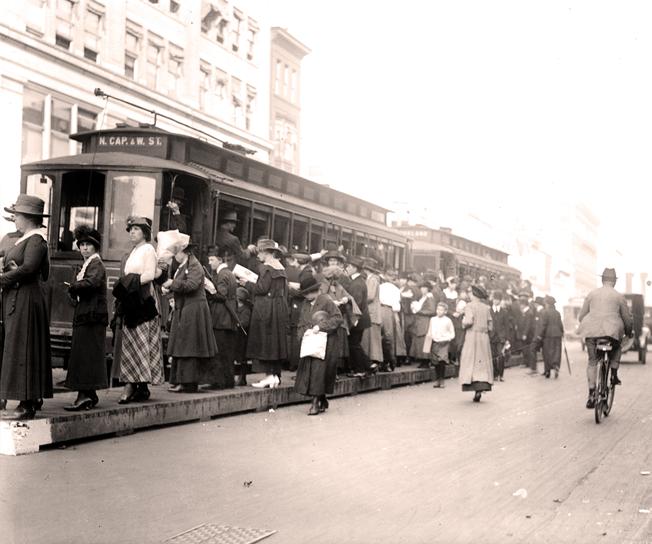 Old photo of people waiting for a tram at a stop in Washington